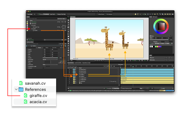A Reference is simply a Cavalry Scene file (.cv) that has been imported to the Assets Window much like an image or video asset. A Reference can then be imported into several other Scene files and so any changes made to the original Reference are then reflected within those parent files.